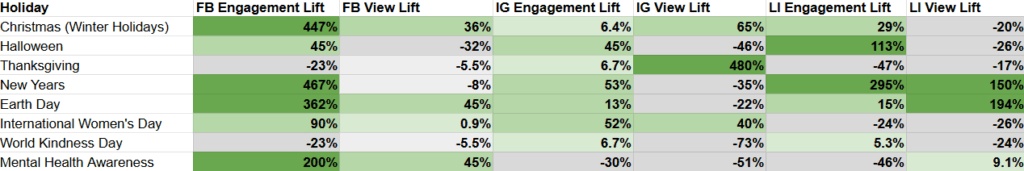 Although the output contains substantial numerical data, the interpretation is straightforward. The percentages indicate performance differences between posts related to specific holidays or observances and the monthly content average for their respective months. For instance, our Facebook post achieved 447% higher engagement and 36% higher views than the content average for December, the month in which that post appeared. Vice versa, negative percentages indicate that the holiday or observance content scored lower than the average monthly posts for each metric and platform.