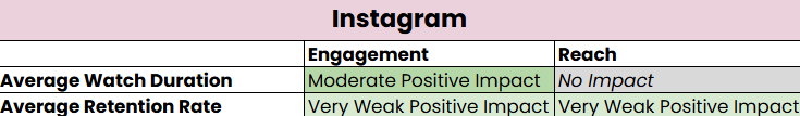 We took average watch duration and retention rate across all video content on each platform and modeled them against engagement and reach to test for linear relationships. For these outputs, we removed extreme outliers due to the wide performance variation of reel content across both platforms. What we call extreme outliers, most people will also call viral.